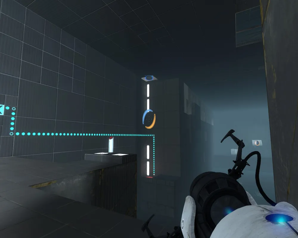 Продолжаем выполнять испытания. В девятой по номеру камере несколько раз прыгаем на воздушной панели и тем самым встречаем Уитли. Потолок опускаем, и мы можем создать на нем портал, еще один на потолке подальше. Осматриваемся и видим ровно три полусогнутые платформы. Начнем с той, которая направлена к консоли. Создаем портал и возвращаемся к воздушной панели. Благодаря инерции мы может попасть к консоли и активировать ее. Проделав эти же самые действия, попадаем к направляющему кубу. С помощью него переламываем лазер примерно на девяносто градусов. Не спешим создавать порталы для направления его к отверстию. Сначала попадем наверх к выходной двери, как обычно используя полусогнутую платформу и воздушную панель и только затем, уже, будучи наверху легко сможем направить лазер в отверстие. В десятой камере добираемся до лазера с помощью воздушной панели. Встаем прямо напротив него. Слева видим куб, справа высокую белую стену, на которой создаем портал как можно выше. Соответственно и внизу создаем портал, куда мы сможем нырнуть и по инерции оказаться возле куба. Забираем куб и вместе с ним летим к лазеру и перекрываем его. Первое препятствие убрано. Наш перелет теперь окажется куда более продолжительным. Оказавшись еще выше, замечаем, справа отверстие для лазера, слева стену, через которую может быть направлен лазер. Активируем консоль и дожидаемся, пока к нам прилетит направляющий куб. Создаем портал на стене напротив отверстия, берем куб и прыгаем вниз. Убираем обычный куб, а вместо него ставим направляющий куб и собственно преломляем лазер на девяносто градусов, как раз к стене и создаем портал. Теперь луч направлен на отверстие расположенное наверху. Все препятствия убраны, хватаем обычный куб спрыгиваем вниз и начинаем наш долгий перелет. Кидаем куб на кнопку. Далее нас ожидают мосты. Перебираемся на другую сторону, создав продолжение моста при помощи порталов. Активировав консоль, можно заметить, как кубы падают в воду. К ним можно попасть, создавая мосты на уровень ниже нашего расположения в данный момент. Пройдя очередной тест, встречаем Уитли, он пытаемся помочь нам выбраться. В следующем испытании, создаем порталы – один на стене другой чуть выше моста. Спрыгиваем на него и в его направлении создаем еще один портал. Возвращаемся к консоли. Если активировать ее, видим что кубы падают в воду, как раз под ними и создаем портал для мостика. Забираем куб и добираемся до кнопки, через мостик. В очередном тесте нас ожидают турели. Уничтожить их очень просто, достаточно расшатать, чтобы они упали. Для этого используем различные махинации. Например, роняем на них кубы или создаем порталы прямо под ними, подкрадываемся сзади, либо вовсе идем на таран. В следующем испытании используем мостик для защиты от многочисленных турелей, расположившихся возле куба. Попадаем наверх при помощи воздушной панели, а что не перелетать устанавливаем мост по центру. Добираемся до куба и расталкиваем турели. Кладем куб на кнопку и быстро отбегаем в сторону. Убрать оставшихся с пути не составит труда. Далее нам предстоит выжигать турели. Встаем на кнопку и создаем порталы под появившемся лучом и на стене по направлению к ряду турелей. Разобравшись с ними, подбираем куб и ставим на кнопку, а с помощью направляющего куба уничтожаем оставшиеся турели и н
